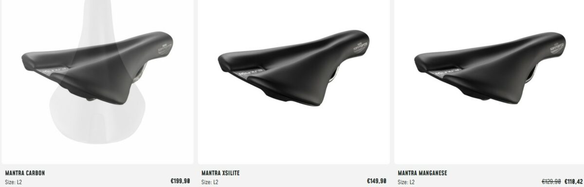 La famille de selle Mantra de San Marco Mantra comprend trois modèles aux dimensions identiques. Seuls la nature des rails, le poids total, et le prix différencient ces variantes :