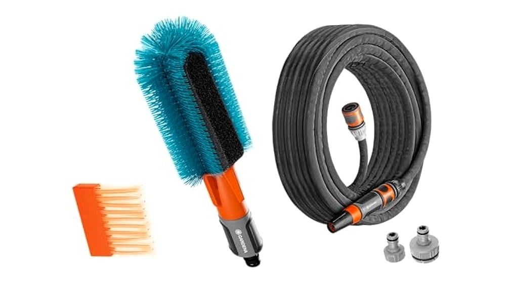 Le kit se compose d’une brosse à vélo Cleansystem, un tuyau textile Liano™ Life 1/2″ de 15 m de GARDENA, un kit de raccord avec nez de robinet du système original GARDENA, des raccords et une lance d’arrosage. Tout cela est complété par 10 bâtonnets de nettoyage Cleansystem, qui viennent s’insérer dans le manche de la brosse.