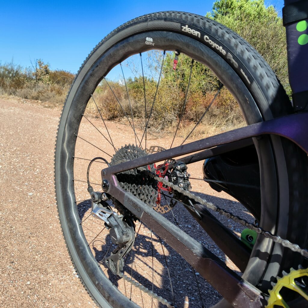 En version Pro, il bénéficie de la gomme spécialement conçue pour le gravel : la Silica Compound, qui le rend roulant tout en offrant un grip optimisé et une bonne résistance à l’usure. Cette version Tubeless Ready bénéficie d’un renfort de la carcasse de tringle à tringle. Ces dernières sont en aramide et la carcasse tressée en 120 TPI. Il est à noter que le Zleen Coyote est disponible en différents coloris de flancs : noir, gris ou beige. Deux dimensions sont proposées : 700 x 38C (40-622) et 700 x 42C (44-622). C’est cette dernière dimension que j’ai pu tester, dans une version Pro à flancs gris. Du côté du poids, j’ai pesé un exemplaire à 520 g, et l’autre à 575 g. On n’est pas en présence d’un pneu des plus légers, mais cela reste dans une moyenne encore acceptable. Sa largeur est conforme, mesurée à 42 mm sur une jante de 24 mm de largeur interne.