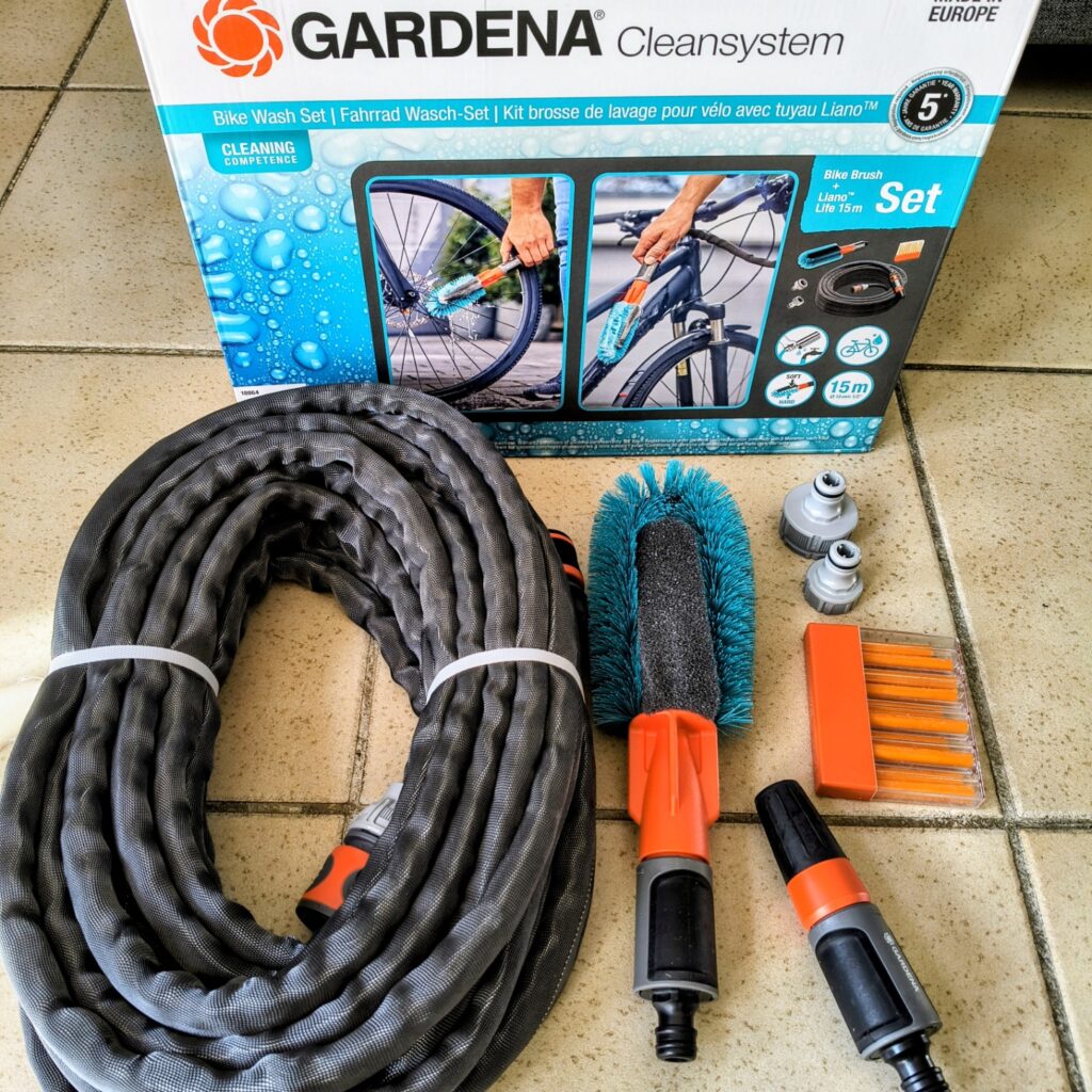 À vrai dire, et bien avant de recevoir ce kit, j’utilisais déjà du matériel Gardena pour nettoyer mes vélos, en l’occurrence celui-ci :