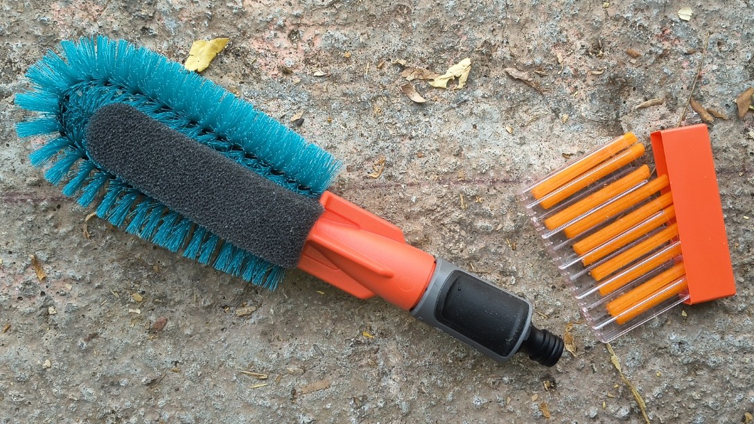 Troisièmement, il est temps d’évoquer la brosse, qui constitue finalement la seule innovation de ce kit. En son centre, l’éponge est douce et se trouve bien utile pour nettoyer les parties les plus sensibles à l’abrasion, comme la peinture du cadre notamment. Celle-ci est bien pensée, et peut se remplacer indépendamment. La continuité du débit d’eau, réglable par rotation du manche, est appréciable pour le nettoyage.