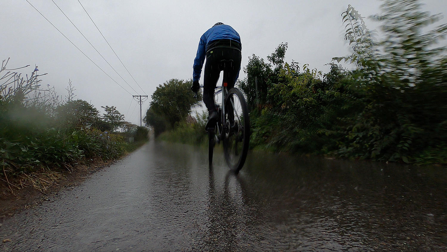 Sous la pluie cette veste est efficace. Je l’ai testée sous une pluie moyenne mais bien mouillante. Le gouttes d’eau perlent à la surface de la veste et roulent avec le vent. À l’arrivée, le test consiste à vérifier que le maillot en dessous est toujours sec : c’est le cas. Mon seul regret avec cette veste est que la fermeture n’est pas à double sens. Cette option est pratique pour attraper une barre dans la poche arrière du maillot.