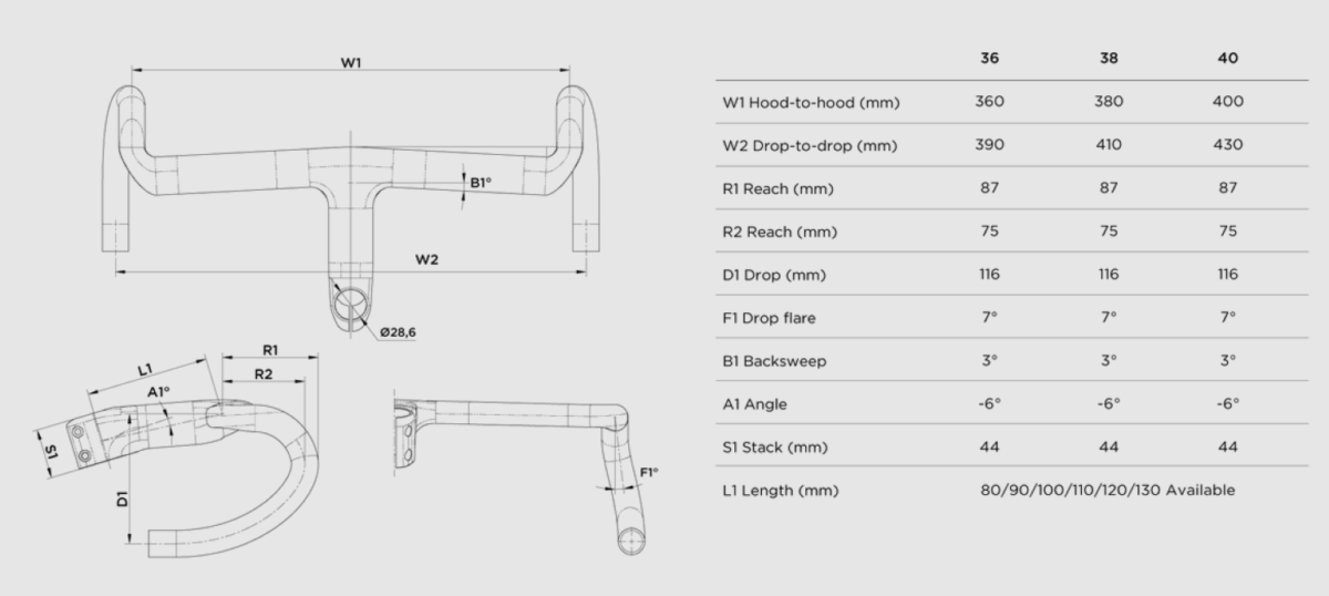 Black Inc propose un panel de dimensions pour trouver le cintre qui correspond a notre machine. Ainsi, trois largeurs sont disponibles : 36, 38 et 40 cm avec six longueurs de potences allant du 80 au 130 mm. De plus, le support pour le compteur est vendu avec le cintre. Celui-ci se fixe sous le cintre dans le prolongement de la potence.