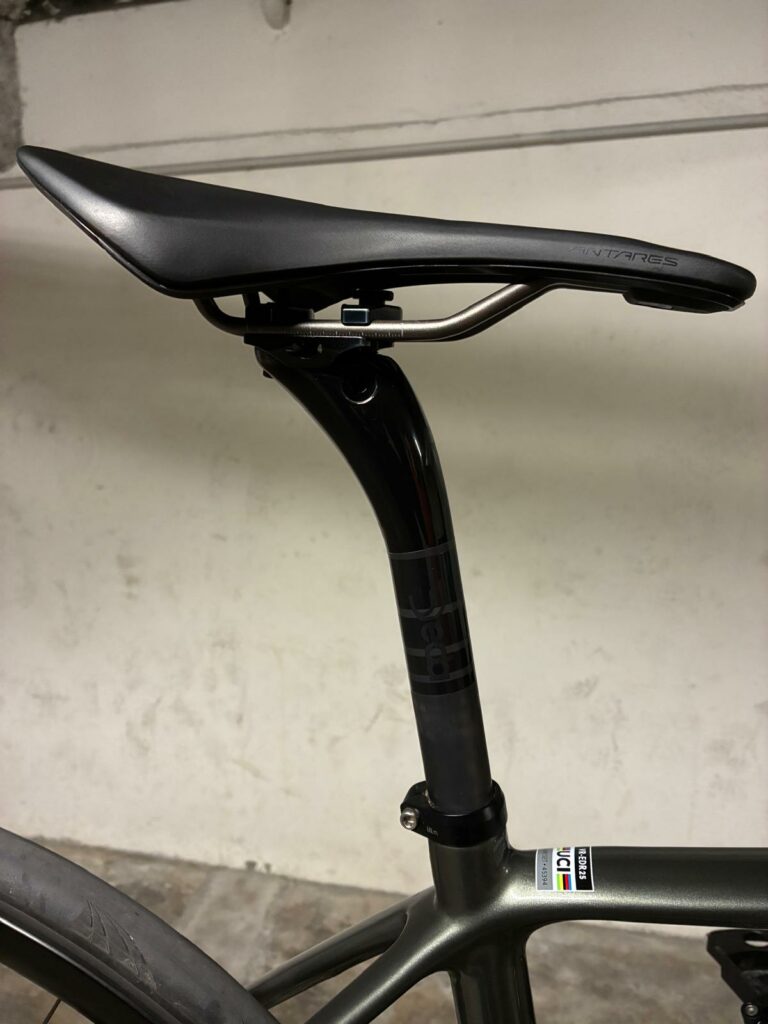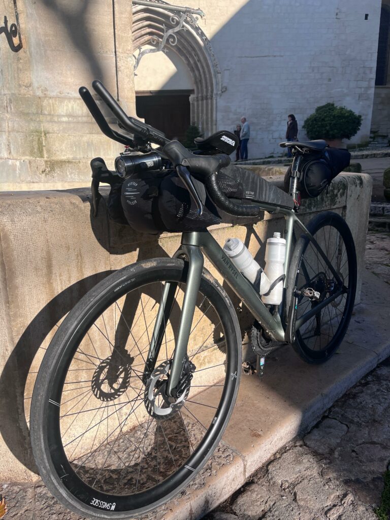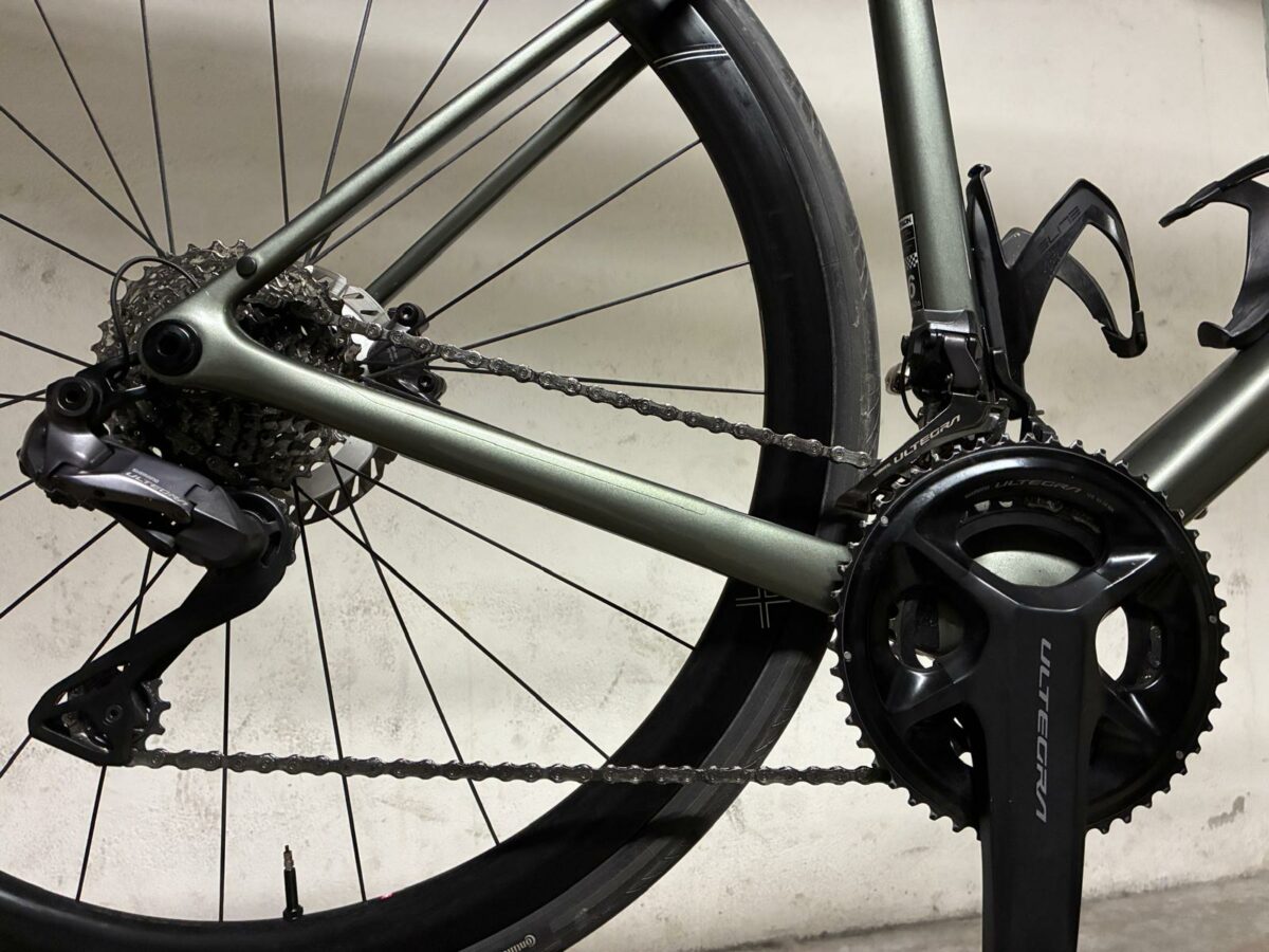 Départ 6h00 du matin, Aubagne. L’air est froid et humide, le silence n’est rompu que par le cliquetis de la roue libre. Face à moi, une robe peinte d’un élégant vert kaki cendré qui habille un cadre de seulement 830 grammes en taille M. Cette esthétique sobre souligne une volonté de performance pure : chaque gramme compte pour affronter les 4935 mètres de dénivelé de mon parcours. Le vélo affiche un poids contenu de 7,9 kg et à peine 10,5 kg avec les sacoches.