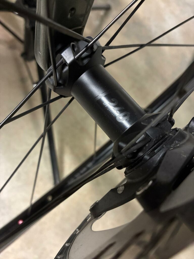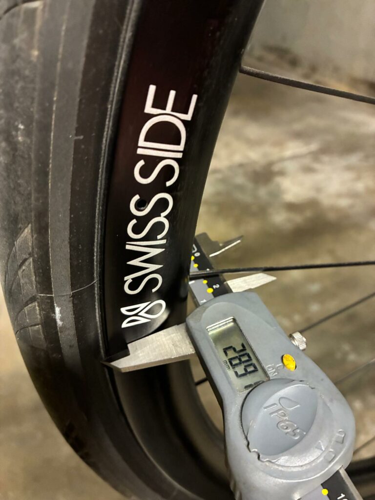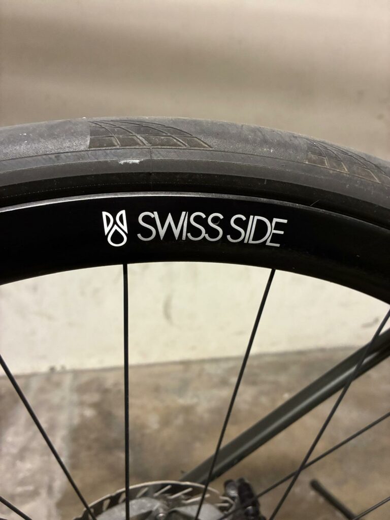 Roues Swiss Side Hadron² All Road : ces roues de 35 mm de haut, équipées de moyeux DT Swiss 240, offrent un équilibre parfait entre aérodynamisme et stabilité face au mistral. Leur largeur interne de 22 mm permet d’exploiter pleinement le volume des pneus de 32 mm.