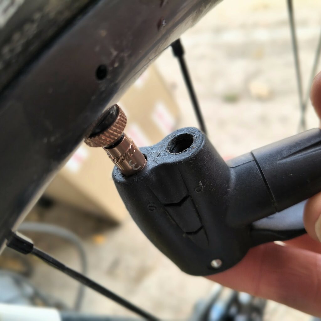 Puis vient alors le gonflage. Comme l’annonce le fabricant, une pompe classique Presta peut toujours remplir sa fonction de gonflage sur la Schwalbe CLIK VALVE. Enfin, pas tout à fait puisque dans ce cas précis, la pression ne pourra pas s’afficher sur le manomètre. Mais pour dépanner, c’est finalement suffisant. J’ai ensuite pu utiliser une pompe spécifique CLIK VALVE (SKS AIR-X-PLORER CLIK VALVE 10.0). Le constat est que le débit d’air est en effet à la hausse comparé à un système Presta traditionnel. Pour autant, ce n’est pas non plus révolutionnaire sur ce point.
