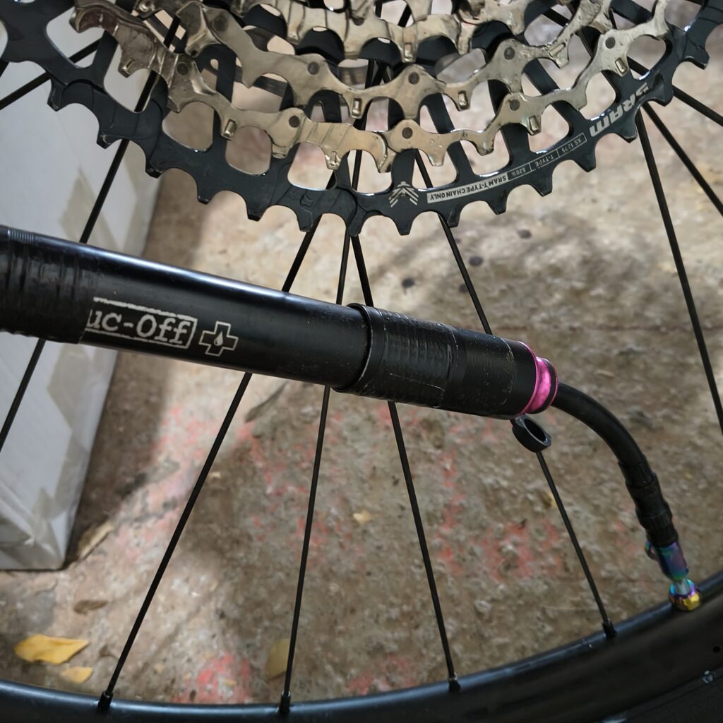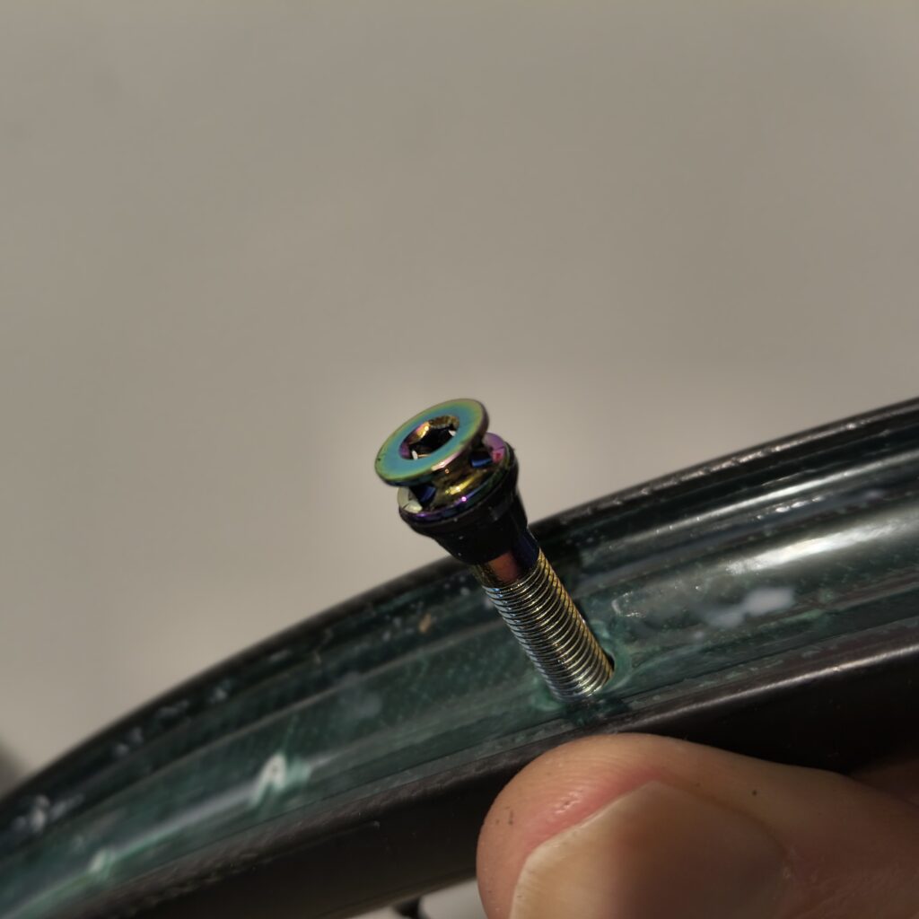 Puis, à la main ou grâce à la mini-clé fournie, on vient fermement visser la deuxième partie équipée du robinet. Enfin, un embout vient se visser pour protéger l’orifice. Muc-Off propose plusieurs tailles afin de s’adapter à la plupart des jantes du marché.