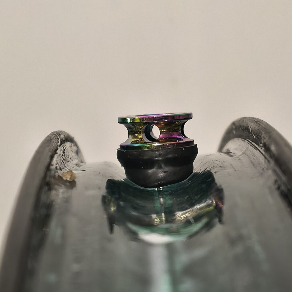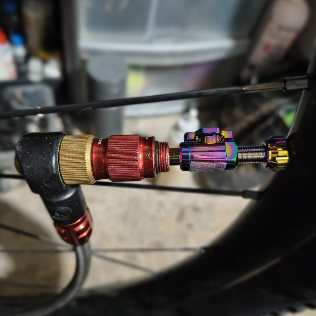 En premier lieu, il faut bien admettre que la finition est excellente (construction en aluminium usiné CNC de qualité 7075 avec une vanne à bille en acier inoxydable). Le choix de coloris permettra de personnaliser facilement un beau montage. L’introduction du liquide préventif se fait soit en retirant la deuxième partie équipée du levier, soit de façon plus étroite par la partie finale, sans démontage. En cela, rien à redire, c’est sensiblement identique à une valve Presta quand on retire son obus, sauf qu’ici aucun risque de venir obstruer le système avec le liquide préventif, tant l’alésage est libre d’obstacle. Quant au débit, pour gonfler, dégonfler, ou “faire claquer” le pneu tubeless, il est effectivement très important. La conception parfaitement droite de l’alésage central est sur ce point une réussite. Pour ajuster, rien de plus simple en actionnant le levier.
