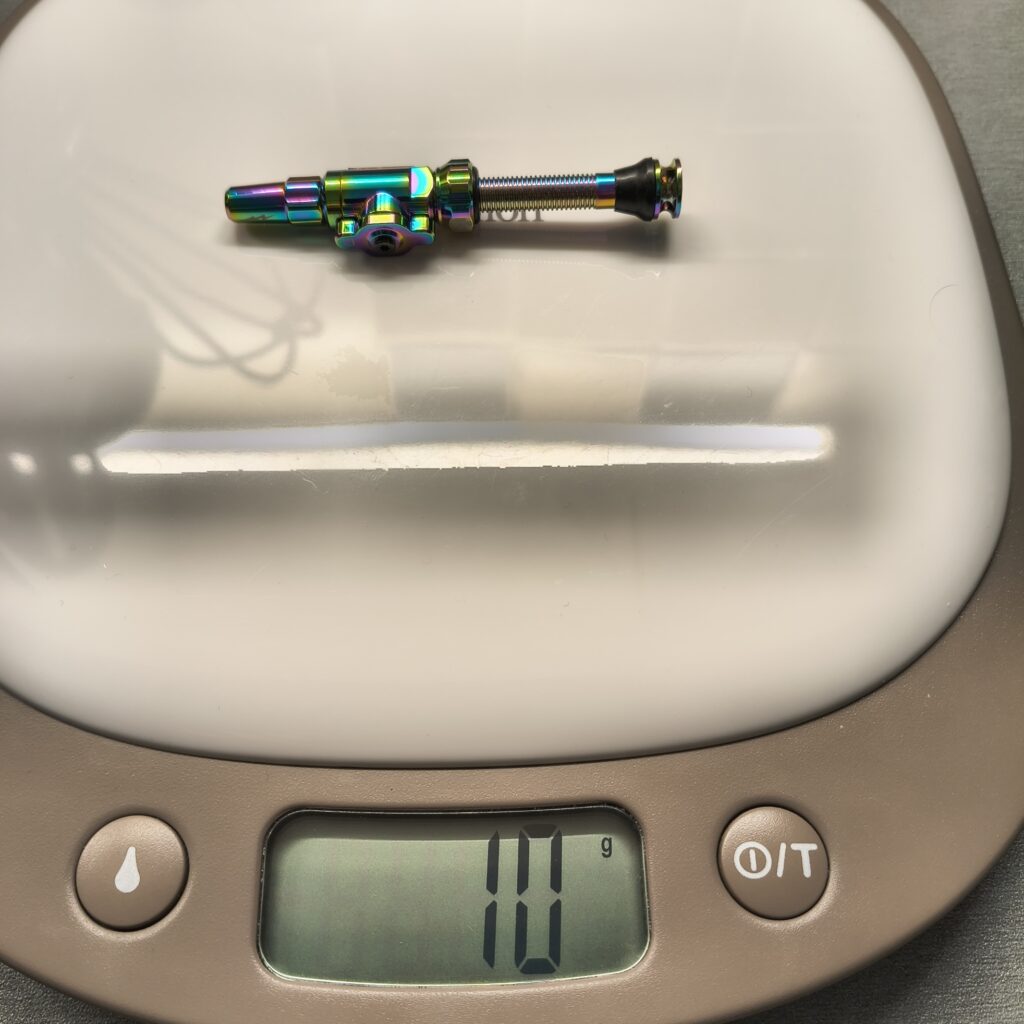 Du côté du poids, pour cette version “Large”, la balance indique 10 g pour une valve complète. Contrairement aux autres produits qui vont suivre, sensiblement du même poids qu’une valve Presta, j’ai tenu à le préciser car c’est de loin la plus lourde (exactement le double du poids d’une valve complète Presta de longueur équivalente). Et ce, même dans cette version dite “lite“.