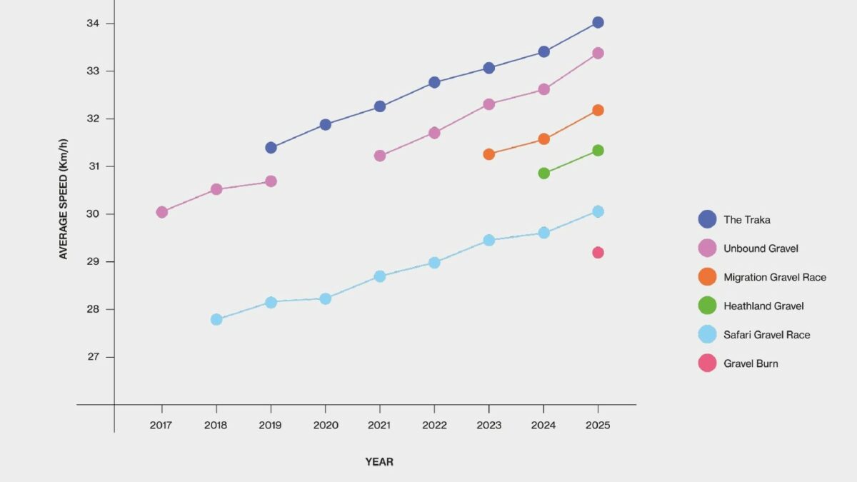 Clairement, le projet de ces roues en carbone a pour origine la hausse constante, et impressionnante, de la vitesse moyenne constatée sur les grandes courses gravel (source Fulcrum) :