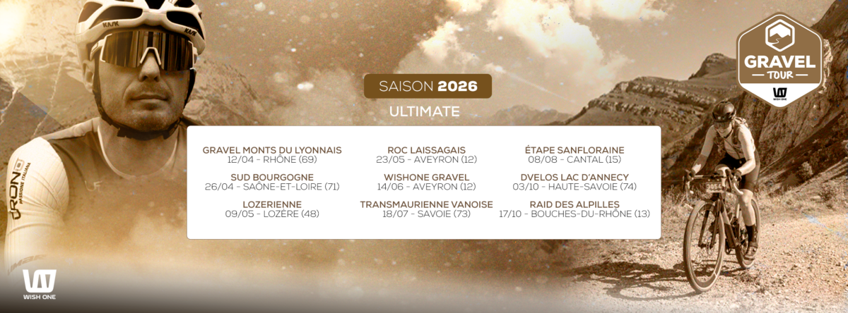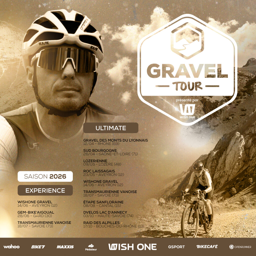 Dans quelques semaines débutera le Gravel’Tour Wish One, un challenge qui cette année se renouvelle, avec de nouveaux partenaires, et en premier lieu le fabricant aveyronnais Wish One qui prend la suite de Cannondale. Aussi, c’est non sans un certain intérêt que nous vous présentons en quelques lignes ce challenge renouvelé pour 2026. Ce challenge investira de nombreux territoires en France, avec, entre autres : les Grands Causses, les Gorges du Tarn, le Massif Sud Bourgogne, les Monts du Lyonnais, et le Massif des Alpilles.