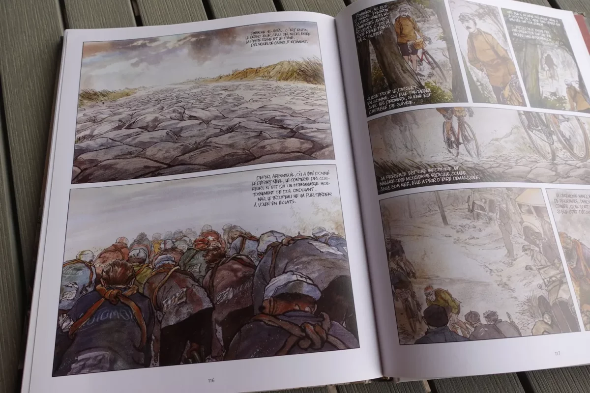 Le pavé de ce Paris – Roubaix, jeté dans la mare de ma sortie paisible du lundi matin, a créé le trouble dans mon esprit d’observateur du monde du vélo. Est-ce que cette course ne serait pas devenue le mausolée d’un cyclisme disparu, auprès duquel on viendrait rendre hommage tous les ans au mois d‘avril ? C’est peut-être encore la seule course qui nous offre cette part de suspens qui nous tient en haleine jusqu’à l’arrivée sur le vélodrome de Roubaix. Je me souviens de mon échange avec le dessinateur Christian Lax. Il me disait, « Dans l’inspiration, ce qui me parle le plus, c’est l’époque des pionniers, où le vélo était réellement une aventure peuplée de personnages romanesques. Mal équipés, pour beaucoup livrés à eux-mêmes, ils roulaient sur des routes qui n’en étaient pas, dans des conditions propices à créer de l’épique. » Il précise en me citant le bouquin de Philippe Bordas :”Forcenés”.  Lui aussi il s’arrête dans son livre aux années Hinault.