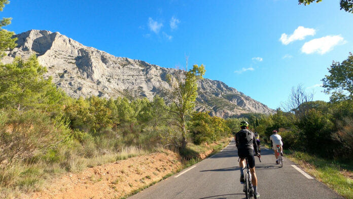 Que j’ai adoré ! Ce brassage humain et ce parc de vélos hétéroclites m’a ravi. Ce n’était pas la réplique nostalgique d’une époque ancienne. C’est rare de voir se mélanger ainsi des amateurs du vélo artisanal, des jeunes qui se sont fait prêter un vieux vélo pour l’occasion, des cyclistes venus avec des vélos modernes… La Cezanne leur a permis de se rencontrer, de parler et rouler ensemble. Je me remémore les premières randos de la Bonne Mère entre Aix et Marseille qui ont commencé en 2019. La fois où en 2021 on s’est pris l’orage dans la périlleuse descente, transformée en ruisseau, entre Mimet et Allauch. Nous étions une vingtaine. Bravo Gab d’avoir transformé notre enthousiasme des débuts en véritable événement tout en gardant cette convivialité et son esprit fondateur. Le parcours de ce tour de la Sainte Victoire est superbe et le Mistral est venu nous apporter sa touche locale, sous un ciel bleu sans nuages.